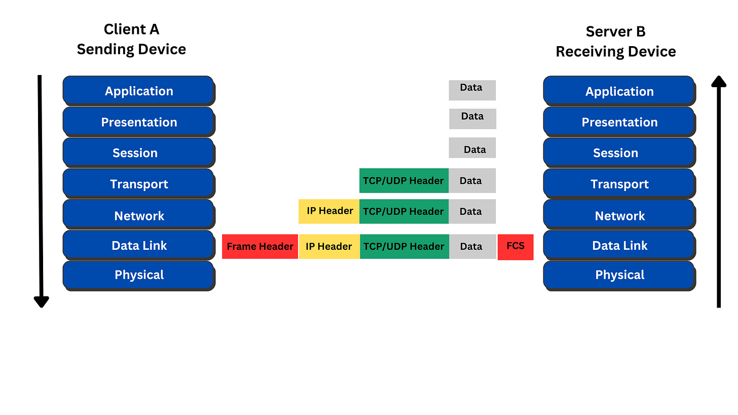 Client Device A needs to upload a file to Server Device B. I will keep this high level for now to explain the encapsulation process. I’ll do a detailed walk-through of the life of a packet in a later post once I get through the fundamentals.
